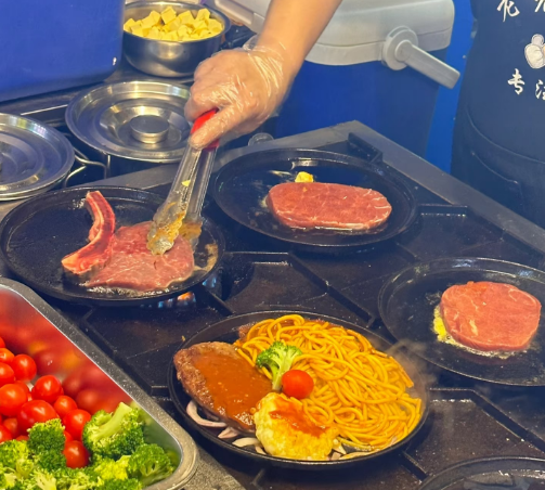 連被唱衰的地攤牛排,也成為這個夏天夜市攤上最亮眼的仔,餐見君家樓下的夜市,就有家地攤牛排火鍋,價格平易近人,最低19.9元一份,五分鐘出餐,還是吸引到了很多大學生、小情侶用餐,攤前總是聚滿了客人。