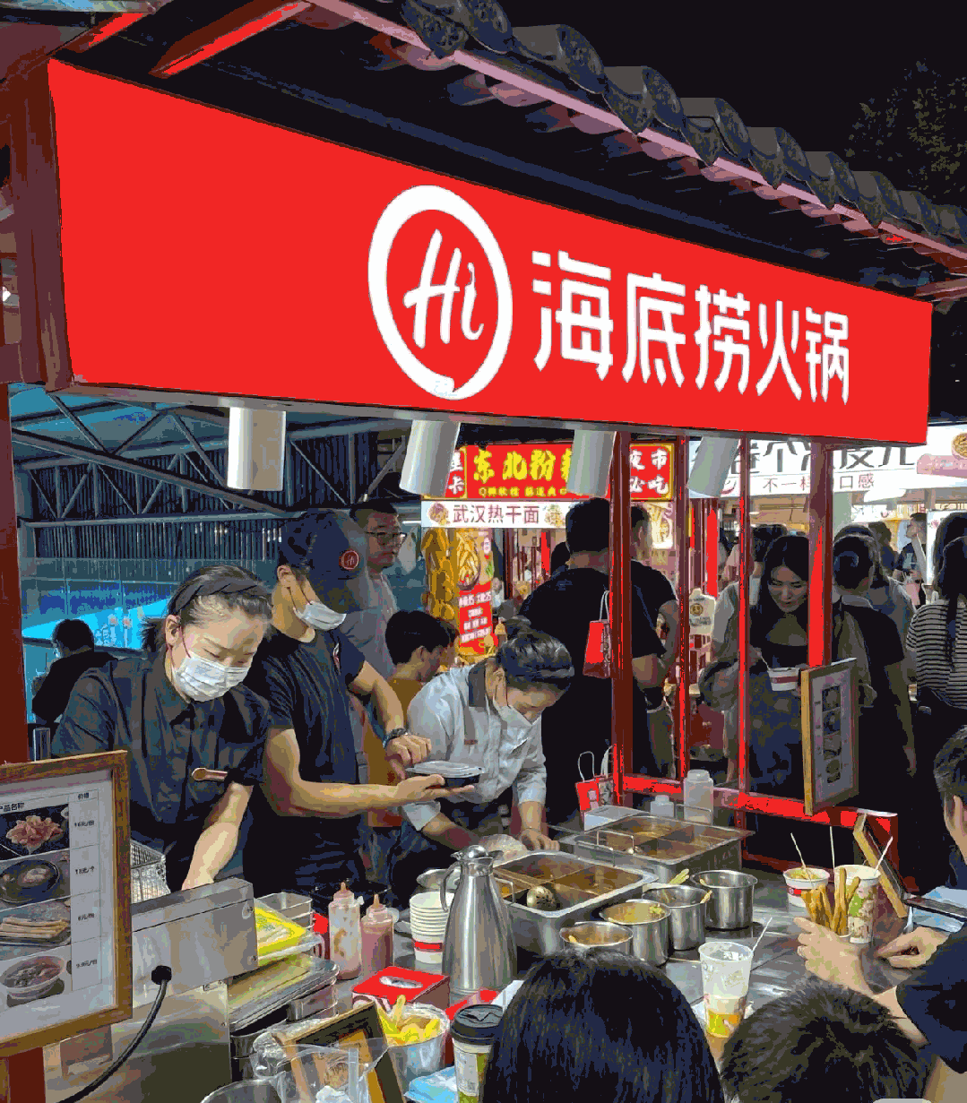 早在2023年,海底撈就在青島李村夜市開設了“海底撈缽缽雞”攤位,引發了全國網友的關注;在鄭州北龍湖金融島亮相的“海底撈夜市攤”,曾被稱為“海底撈極速版”,2024年夏天,又升級為“海底撈露營火鍋”。