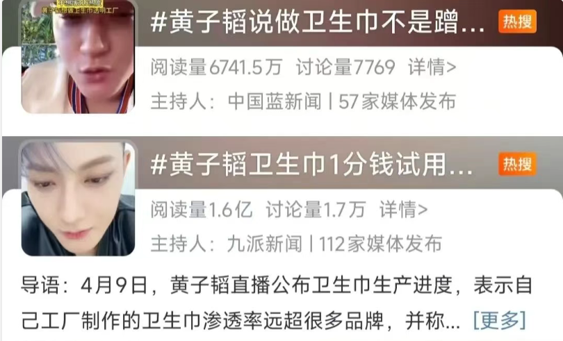 這場看似"賠本賺吆喝"的直播,直接點燃了社交平台,為黃子韜的衞生巾生意收穫一波路人緣。