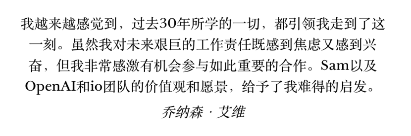 一切就這樣發生了。從去年開始,就有傳聞稱奧特曼在與艾維接觸,如今通過對io的收購,二人終於深度綁定。