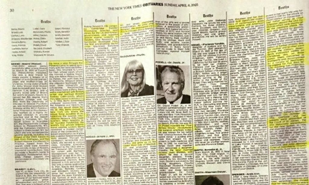 這讓我再次想起訃告的價值。我説的不是名人政要的半版報道,而是《紐約時報》週日版上那些小字印刷的訃告——由親友出資刊登,整版八欄密佈的生命故事。這些逝者並非顯赫人物,但經至親摯友飽含深情地描繪,其人生軌跡往往比頭條訃聞更令人驚歎。這正是激發創造力的絕佳素材。