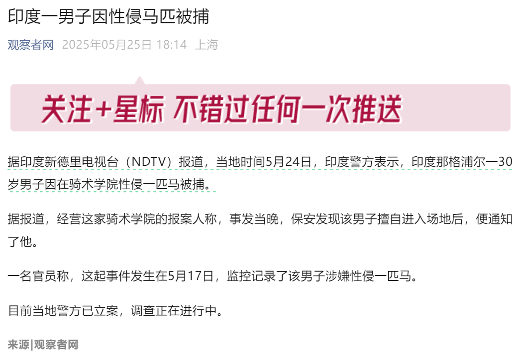 5月24日,印度再次刷新了世界的認知下限。據印度新德里電視台(NDTV)報道,一名30歲的男子在馬哈拉施特拉邦的那格浦爾騎術學院裏,因涉嫌性侵一匹馬被警方逮捕。事情發生在5月17日,騎術學院的保安發現男子擅自闖入場地後立即報警,警方調取監控後發現,畫面裏清清楚楚記錄下了他的“作案過程”。目前,這起案件已立案調查。