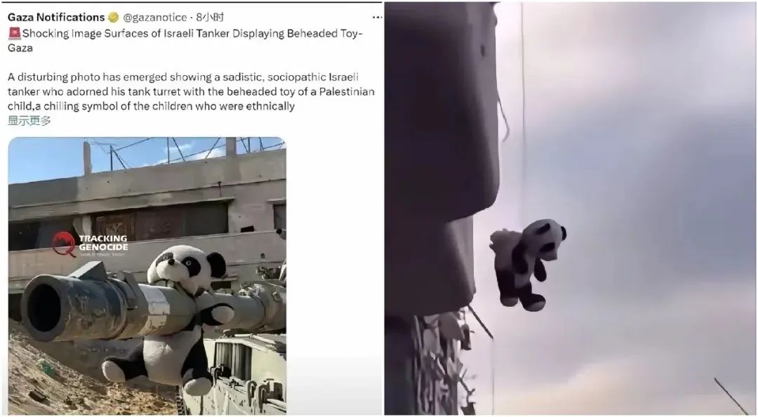 5月25日馬克龍被老婆扇耳光的同一天,社交媒體上大肆傳播以色列坦克指揮官,將熊貓玩偶“斬首”,然後掛在坦克炮管上“示眾”的圖片。如此暴力反人類,西方社交媒體沒一個以“暴力”為由封禁。