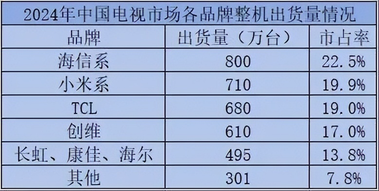 此外,長虹、康佳、海爾三大品牌2024年出貨總量約495萬台,合併市佔率13.8%。