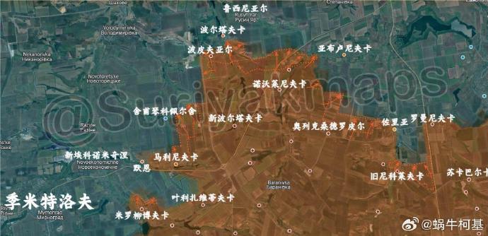 4、奧切列季涅:俄軍繼續清剿佐里亞以南包圍圈,舊萊科尼夫卡已被完全佔領。同時俄軍繼續向奧列克桑德羅皮爾以北推進,並進入亞布盧尼夫卡,還控制了郊區的一系列戰壕系統。此外,俄軍繼續向魯西尼亞爾推進,並攻佔了波爾塔夫卡的第一批房屋。附近的波皮夫亞爾及其附近的戰壕實際上已被佔領。俄軍還逼近舍甫琴科佩爾舍,控制了大部分養豬場,以及擴大了米羅柳博夫卡的控制區,準備封鎖馬利尼夫卡以南的烏克蘭突出部。