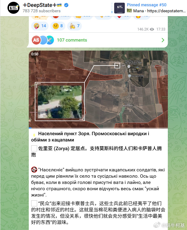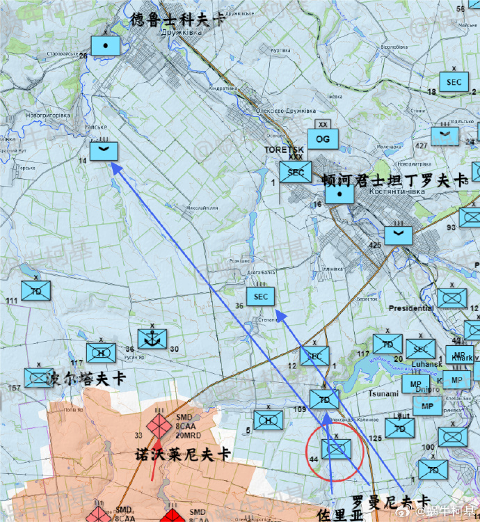 烏軍這邊,44機械旅被緊急從博羅瓦拉過來背鍋,109防衞旅向北後撤,36警察團應該是被打殘了跑到頓河君士坦丁羅夫卡,更離譜的是此前的抗鵝功臣14無人機團直接溜回德魯士科夫卡一帶……