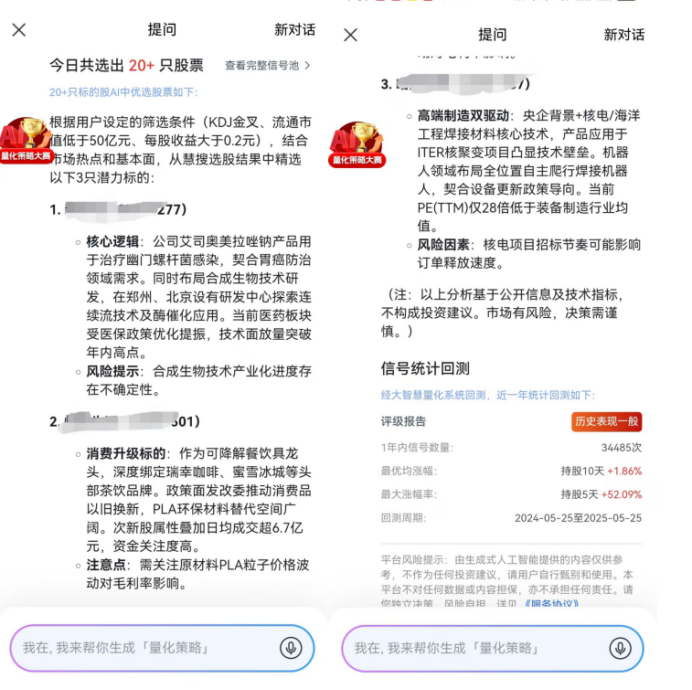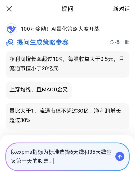 賽事自5月19日正式啓動,至今已完整運行了一週的交易日。作者通過試用發現,用户只需通過語音或文字描述投資思路(作者輸入了“KDJ金叉、流通市值低於50億,每股收益大於0.2元”),AI即通過公開信息和大數據的抓取分析,能在很短的時間內自動解析並生成專屬的量化策略,結合當前市場熱點給出投資邏輯,給投資者參考。