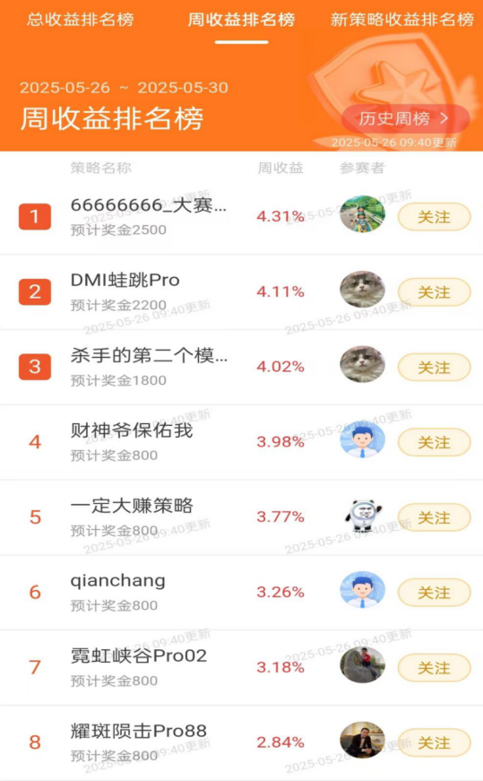 新一週(5月26日-5月30日)數據看,周收益前三名已經達到4%以上收益,從這場AI量化策略模擬大賽的階段性實戰成果來看,市場的交易模式正在悄然發生巨大變化。過去機構投資者依託複雜算法搶佔市場先機的模式,現在普通投資者通過AI技術同樣能實現,量化投資的“平權時代”即將到來。
