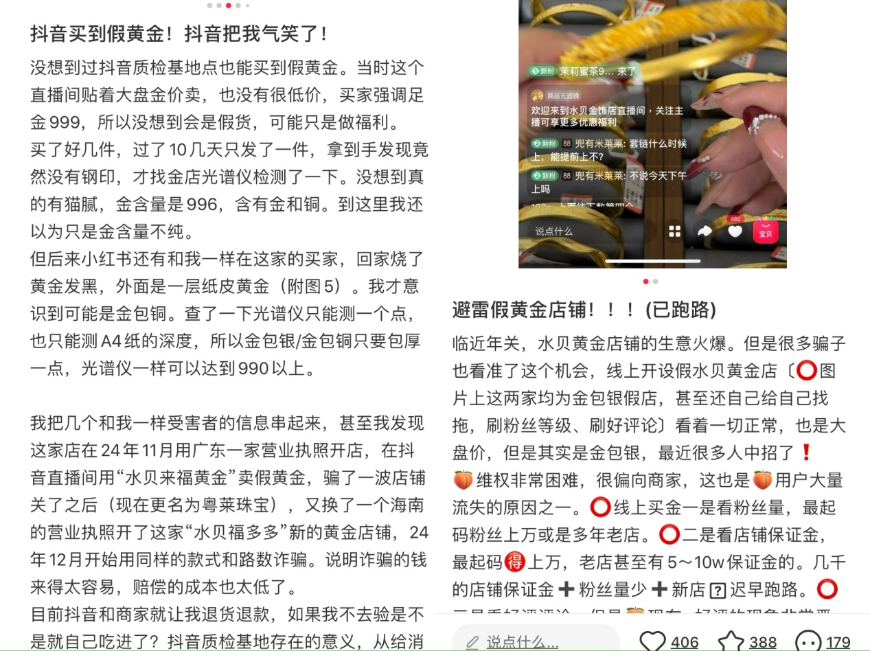 在小紅書上,有網友就曾發佈筆記稱自己在一水貝金飾直播間花一萬三千多元買到了假黃金,“我買的時候,主播強調通體足金999,給我的檢定證書也是寫的足金999。”但如果點進商品詳情頁,材質卻寫的足銀,就是商家篤定一般都不會點進去看。”而在這篇筆記下,有網友評論稱,“這家店已經多次更換店名, 一直沒被關”“好多人被這家店騙”……