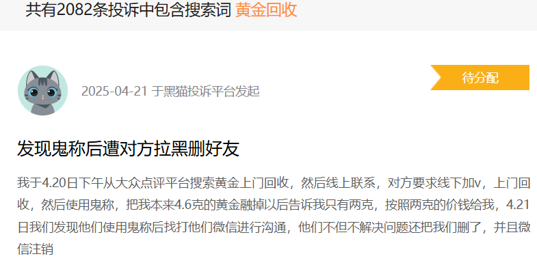 在消費者投訴平台“黑貓投訴”搜索“黃金回收”,截至目前共有超2000條投訴,有不少消費者提到黃金回收的套路包括使用鬼稱、回收後不付錢、亂收手續費等等。