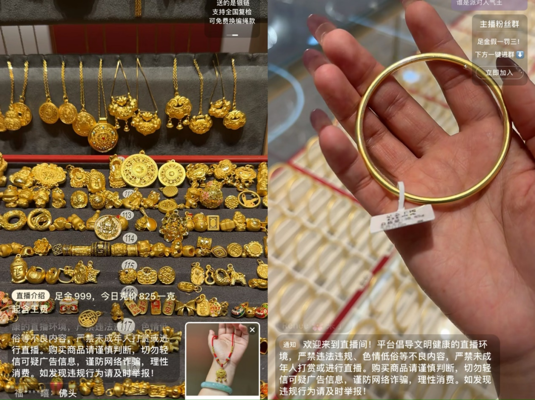 而在一眾帶貨黃金的直播間中,除了有頭部主播和品牌店鋪專業主播的身影,也有不少穿行於水貝市場的“淘金客”。