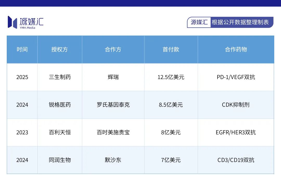 2023年,百利天恆的雙抗藥物引爆行業,其與百時美施貴寶達成的8億美元首付款,創下彼時新紀錄;然而僅一年後,鋭格醫藥憑藉CDK抑制劑殺出重圍,與羅氏基因泰克簽訂的8.5億美元首付款短暫登頂;至2025年,三生製藥與輝瑞的雙抗交易,以12.5億美元首付款悍然衝破10億天花板。