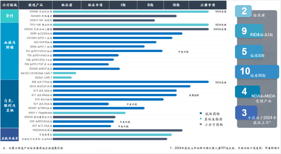 除了獲得輝瑞重金押注的SSGJ-707以外,腫瘤領域其他管線如PD-1/HER2雙抗(SSGJ-705)、PD-1/PD-L1雙抗(SSGJ-706)等仍處於I期階段,距離商業化還有較長一段時間;自免領域的IL-17A單抗(SSGJ-608)雖已提交NDA,但該靶點國內已有多款競品上市,市場空間面臨擠壓;腎科領域的長效促紅素(SSS06)雖然填補了國內空白,但其臨牀價值更多體現在優化給藥方式,難以複製SSGJ-707的重磅潛力。