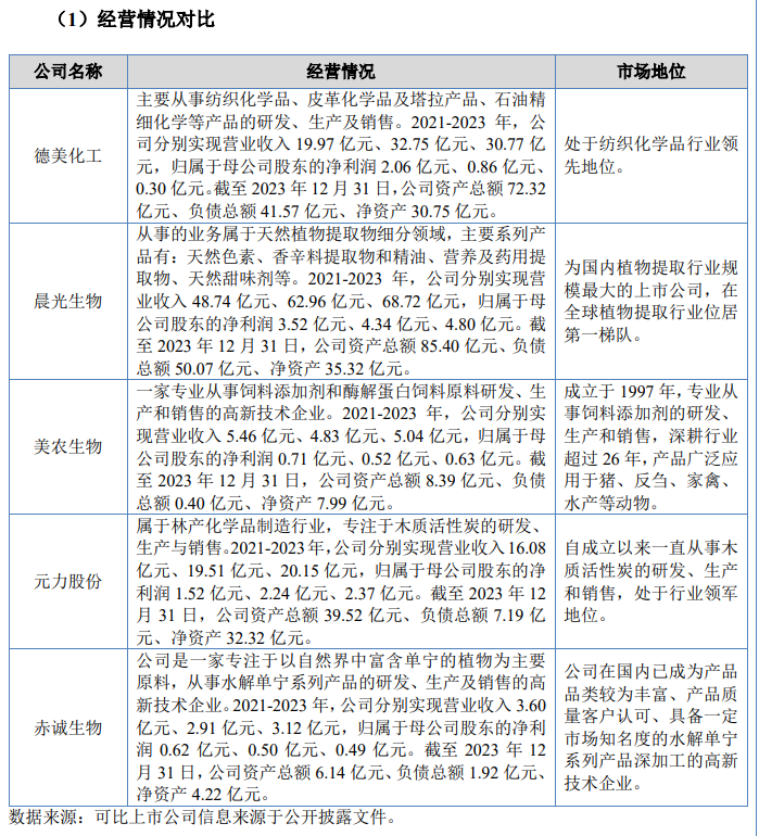 比如市場競爭。雖然赤誠生物在招股書中表示,當前國內尚無與其主營業務或產品相同的A股上市公司,但基於公司所屬行業類別與數據可得性原則,還是可以篩選出不少與公司業務相似或類似的公司,如德美化工(002054.SZ)、 晨光生物(300138.SZ)、美農生物(301156.SZ)、元力股份(300174.SZ)等。
