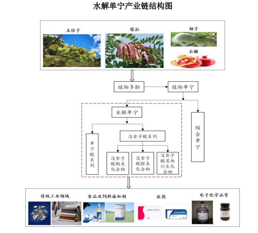 基於上述功能和特性,目前水解單寧可應用在醫藥中間體、化工助劑、飼料、食品、冶金、電子化學品、紡織印染等諸多領域,經濟價值相對較高。