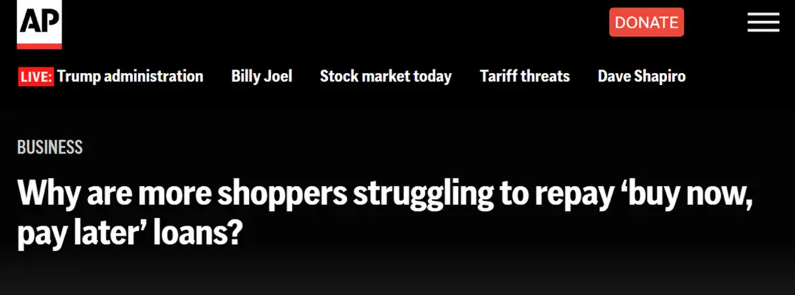 中國日報網5月26日電 據多家美媒報道,原本為短期資金週轉或購買大件商品而推出的“先買後付”服務(buy now pay later,BNPL),正日益成為美民眾購買基本生活必需品的無奈之選,這一現象背後折射出美國消費者財務狀況的嚴峻分化。