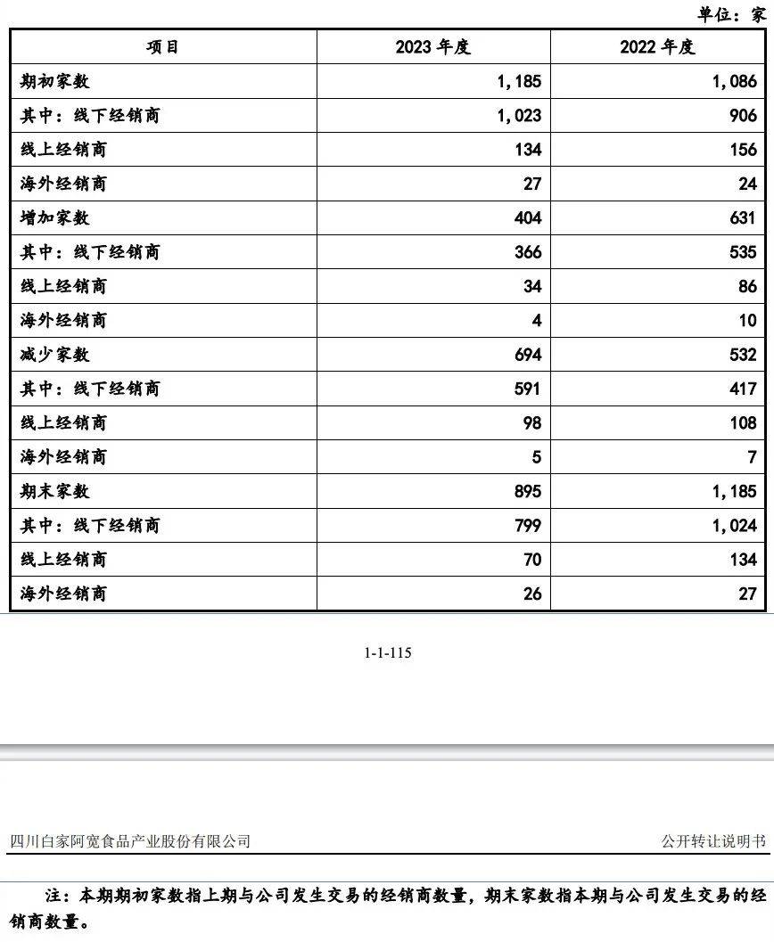 但招股書顯示,2023年阿寬食品經銷商數量鋭減,由2022年的1185家減少至895家。
