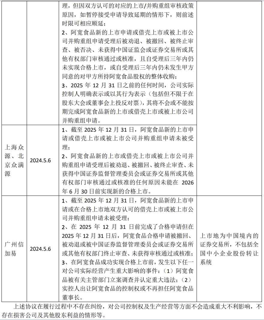 值得注意的是,阿寬食品衝刺上市的壓力並未減輕。2024年財報顯示,公司在多份對賭協議中,將2025年12月31日前新上市申請被受理作為了約定條件。