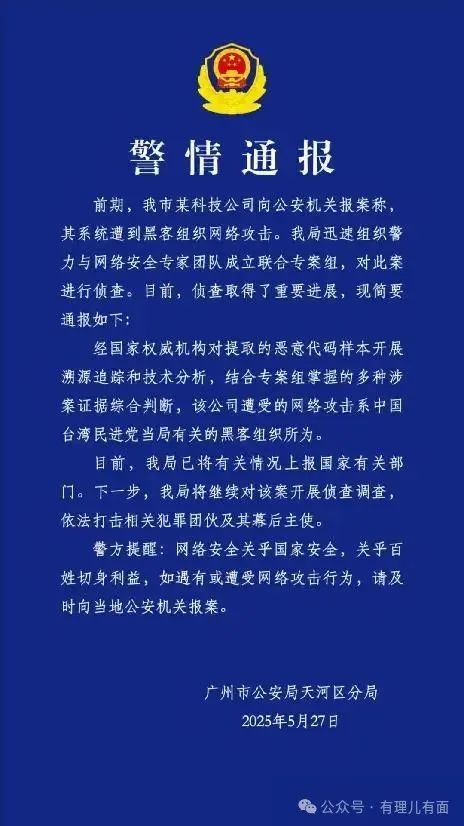 原來,廣州警方已初步查明該公司遭受的網絡攻擊是台灣民進黨當局豢養的黑客組織所為。