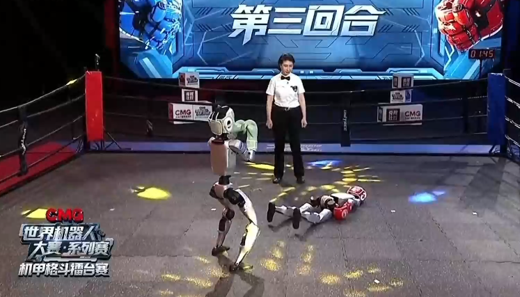 倒地後能否在8秒內快速起身,是這場格鬥賽事中至關重要的一項勝負評判標準,也是對人形機器人軟硬件技術的一次抗壓試驗。第三回閤中,粉色機器人被黑色機器人“重拳”錘倒在地,但未過3秒,黑色機器人被粉色機器人不小心絆倒,畫面十分有趣。但黑色機器人迅速調整腿部位置後,於5秒內起身。在另一回閤中,機器人被“重拳”擊打後,身體摔出圍繩,足部仍留在場內,但其很快找到平衡點,雙腿支撐後迅速起身站立。
