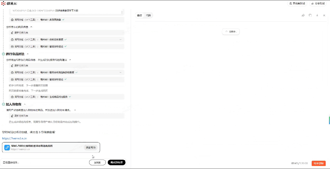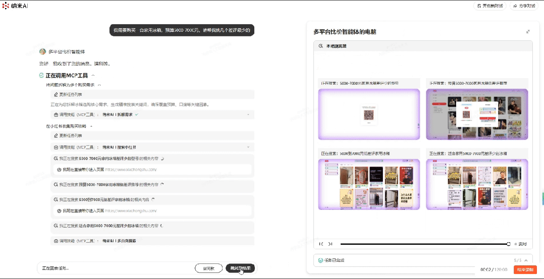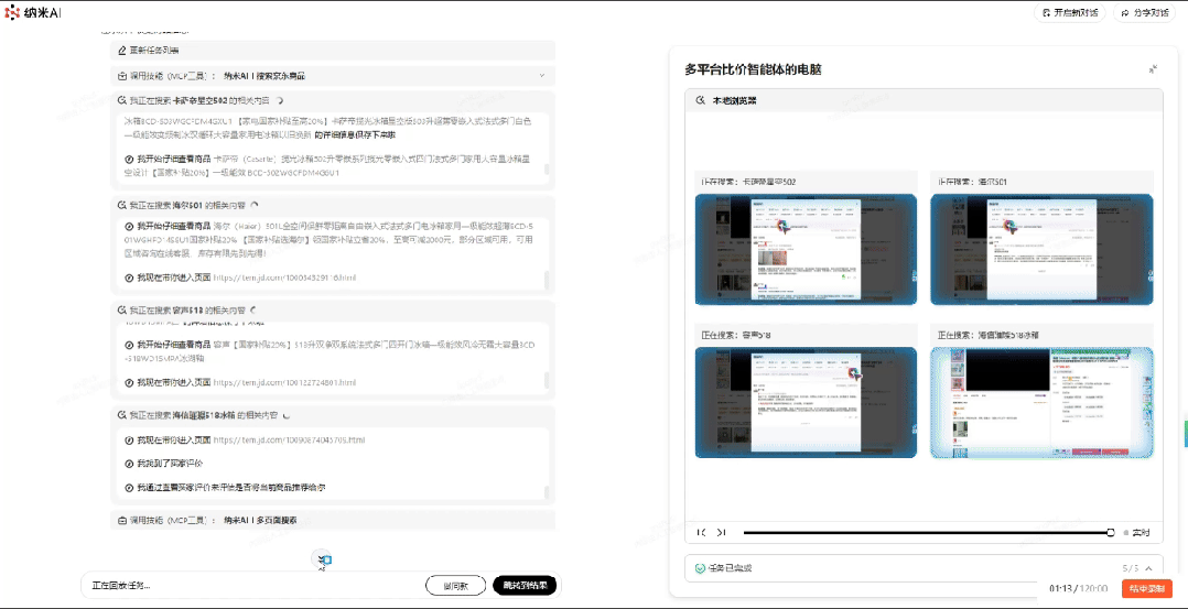 在完成攻略的蒐集和分析後,納米AI超級搜索繼續調用MCP工具,分別在淘寶、京東兩大購物平台上收集和分析相關商品的信息,這個過程同樣是4個AI瀏覽器同時進行。之後再根據電商平台上的實際情況生成對比報告和選購建議。
