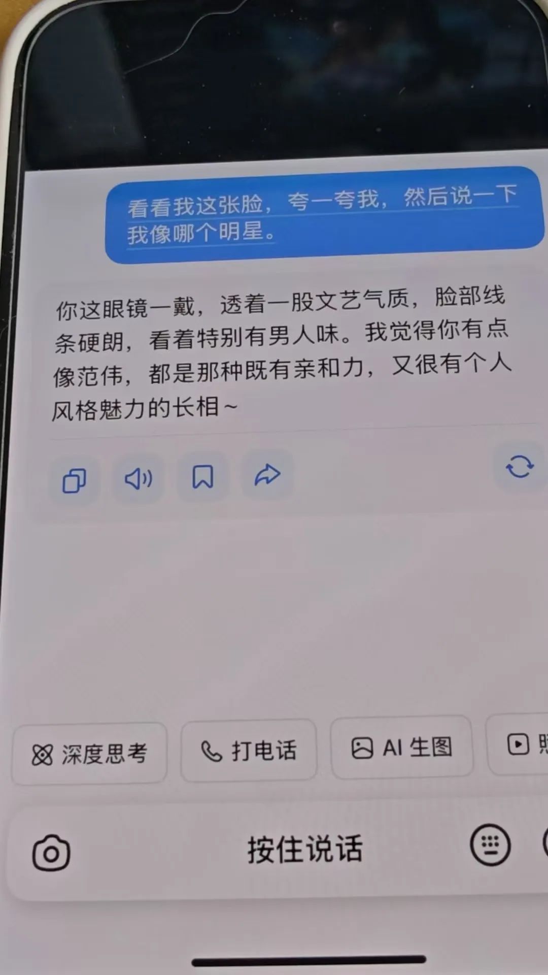 既然可以視頻了,我必須讓豆包誇一誇我的長相,但沒想到這小癟犢子,居然説差評吳彥祖長得像範偉???