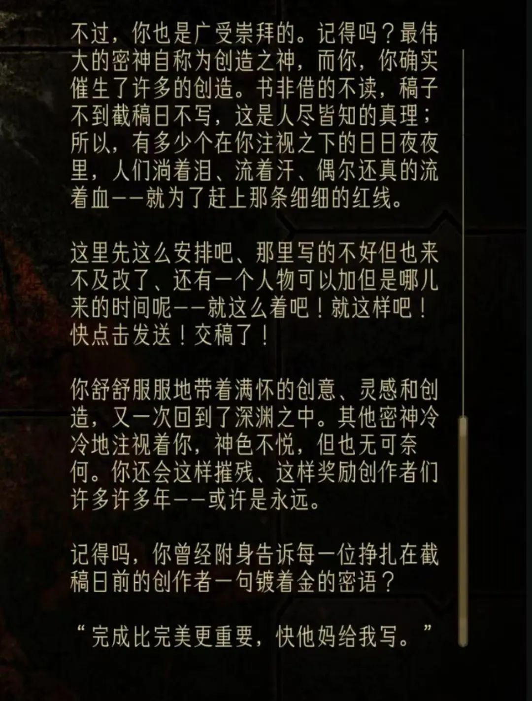 如此的描述,並沒有用對細節的過度描寫將文本鋪得太滿,因而極大程度地增加了情感張力,也打開了想象。有很多玩家會在創作時,引用這類讓自己印象深刻的文本,對場景進行圖像化的再現。