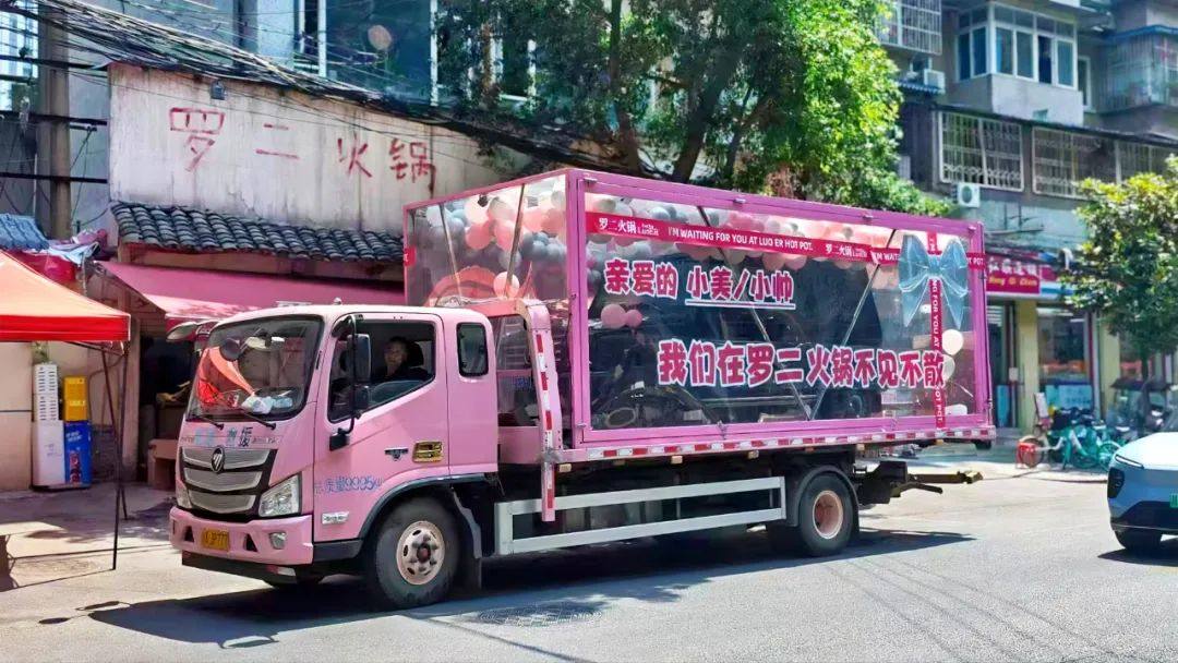 剛剛過去不久的5月20日,羅二火鍋的粉色主題貨車車隊開往成都小關廟、春熙路、建設路和人民公園等繁華路口,車廂裏裝着一輛奔馳大G、粉色氣球以及伴手禮,一場浪漫營銷,讓火鍋店變成告白聖地。