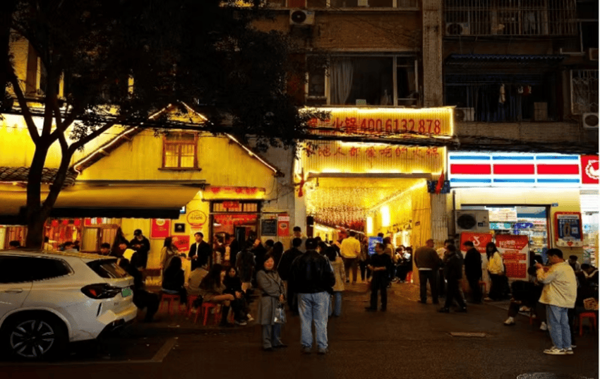 走出成都後,大多數門店也秉持社區基因,例如深圳首店開在“電子一條街”華強北的巷子裏,常有不少掛着“大廠”工牌的白領排隊;烏魯木齊首店開在七道灣南路南湖創造園,讓來自西南的煙火氣融入“大巴扎”。