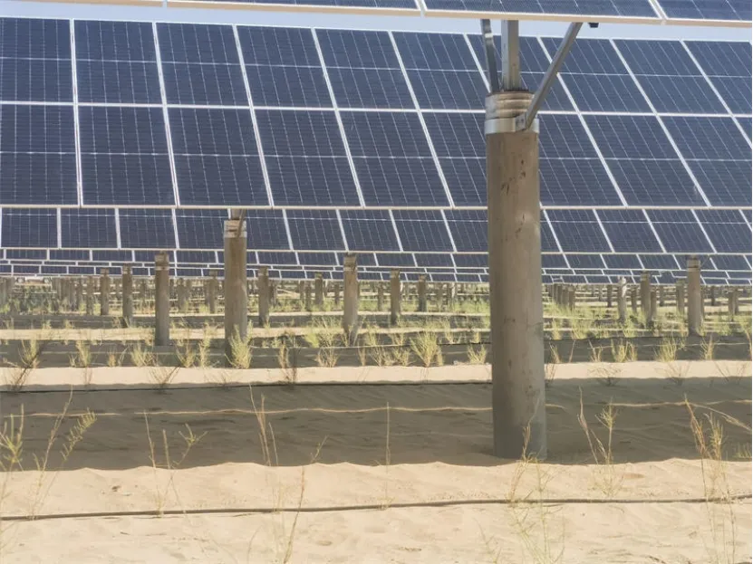內蒙古鄂爾多斯庫布其沙漠是中國第七大沙漠,由於特殊的地理條件和“十年九旱”的氣候特點,這裏的植被極其稀少,尤其是腹地幾乎寸草不生,曾經一度被稱為“死亡之海”,這兒流動沙丘每年吞噬着草場與村莊。而今,光伏陣列織就了一張固沙大網:光伏支架深入沙層,成為天然的固沙樁;板間鋪設的沙障鎖住水分,讓耐旱植物得以紮根。光伏板不僅遮擋了30%的烈日,更將蒸發量降低40%,形成獨特的“荒漠小氣候”。