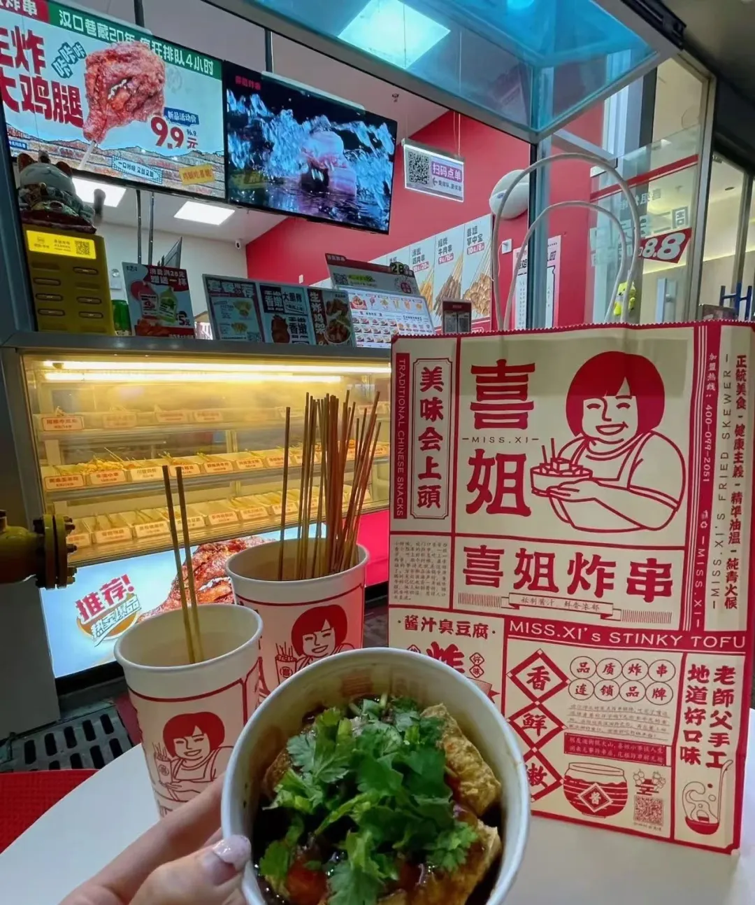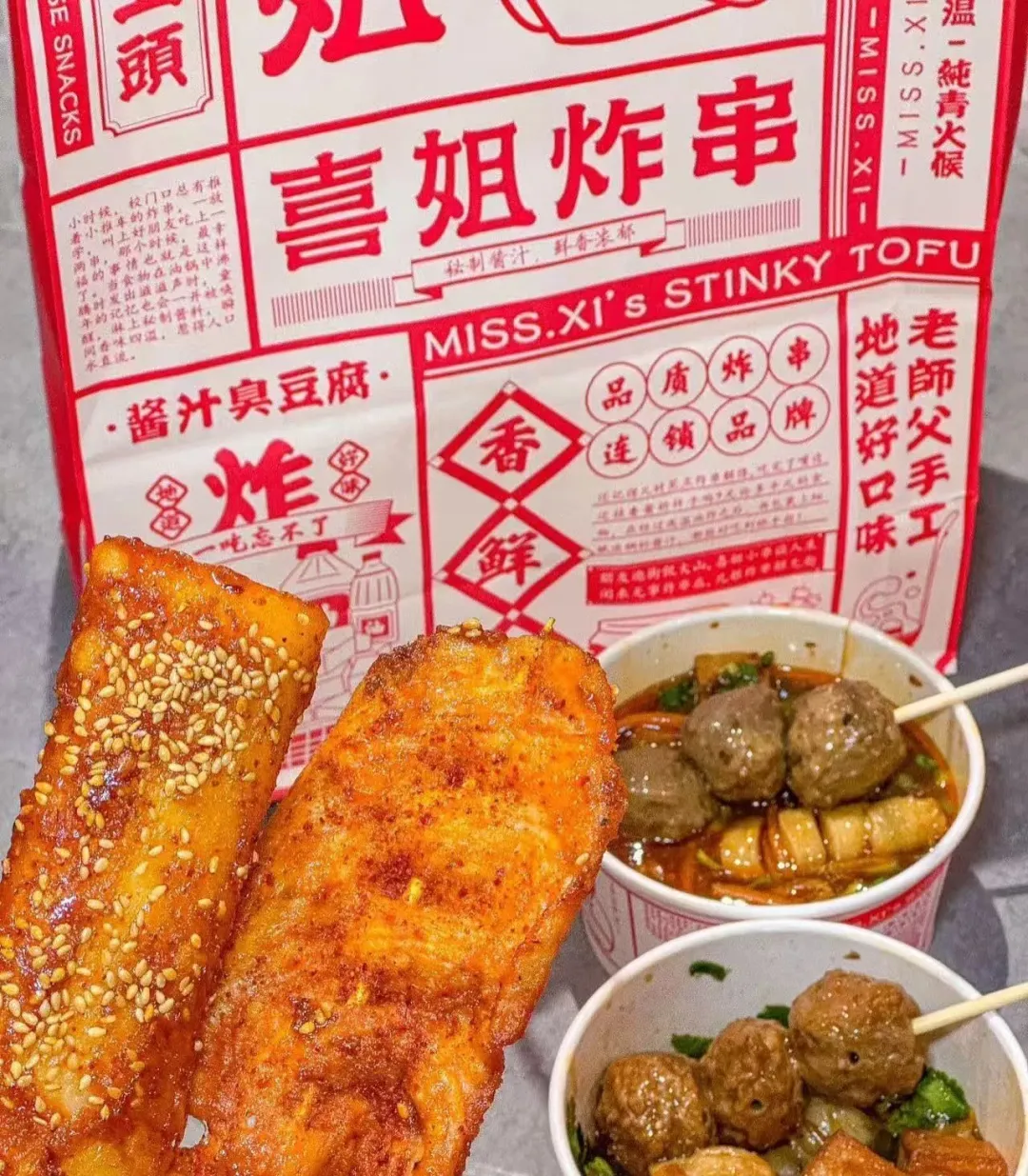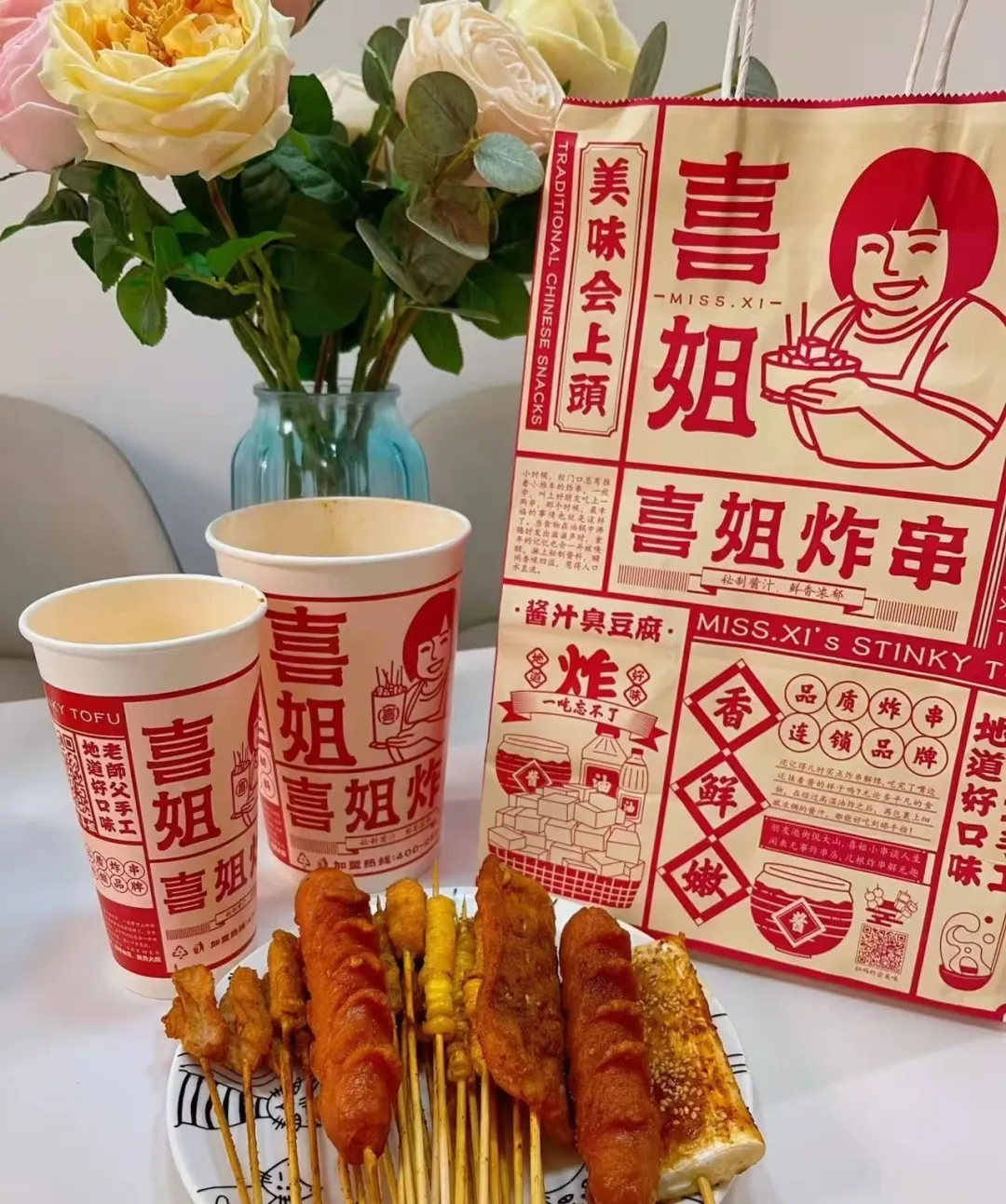 同時喜姐炸串的品牌設計也以紅白主色調和國潮風格LOGO為特色,九宮格炸鍋陳列和透明化製作流程增強了品牌的辨識度和記憶點。這種網紅產品和定製化包裝,也在一定程度上激發了年輕消費者的社交分享慾望,在成功激發社交傳播後,也形成“打卡即廣告”的裂變效應。
