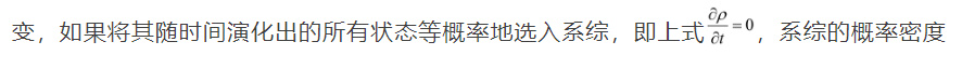 不會隨時間變化,達到穩定狀態,則時間平均和系綜平均結果相同,各態遍歷。需要注意,這裏是ρ對t的偏微分,這和全微分的含義是不一樣的。全微分時,系統的廣義座標和廣義動量都會隨時間而變,但偏微分時它們不會隨時間而變。