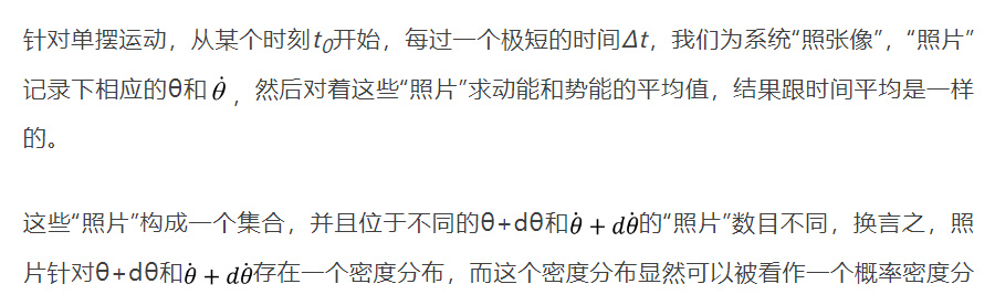 比如,在前面所用的單擺中,我們要求系統的平均動能或者勢能,只要給定時間長度,對動能或者勢能按時間求平均即可。雖然這個時間平均結果會隨着起始觀察時間的不同而不同,但是隻要觀察時間足夠長,這些不同的結果將趨向一個定值,為系統總能量的一半。