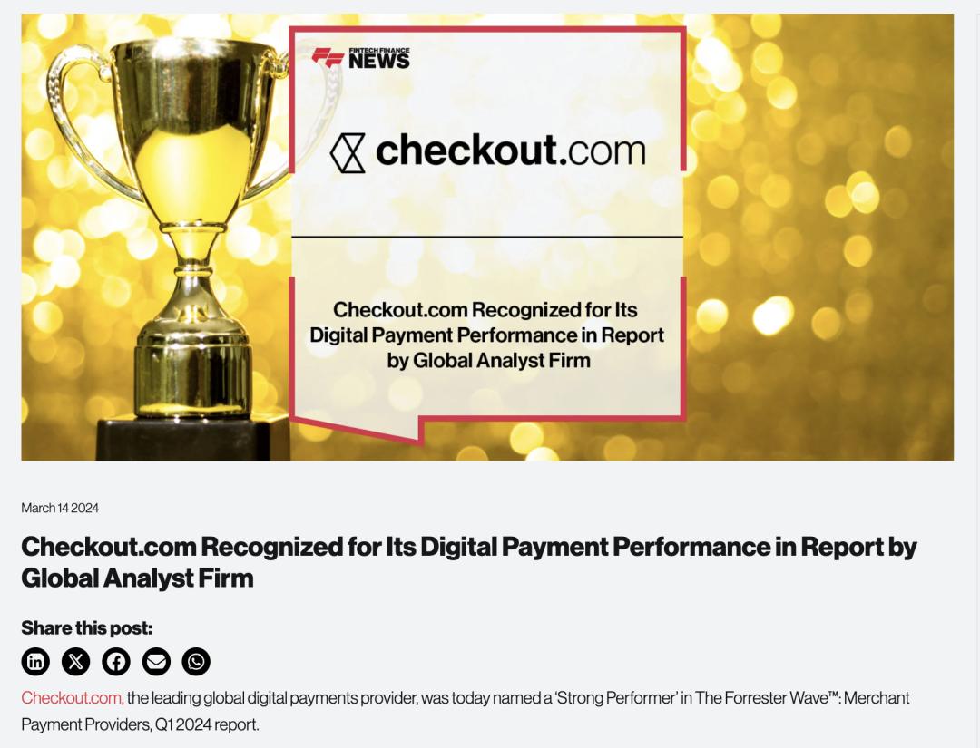 近日,國際知名調研機構 Forrester 所發佈的《The Forrester Wave™: Merchant Payment Providers, Q1 2024》報告中,選定全球最重要的十一家商户支付廠商,Checkout.com 被評選為“領導者 Leader”,並在戰略與產品能力、市場表現與客户體驗滿等其中項目標準中,均獲滿分5分。