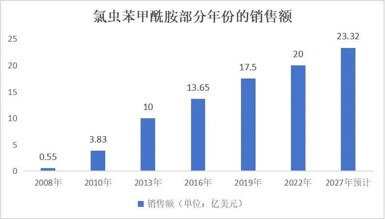上市僅6年後,氯蟲苯甲酰胺已躍居榜首,成為全球市場銷售額第一的殺蟲劑。