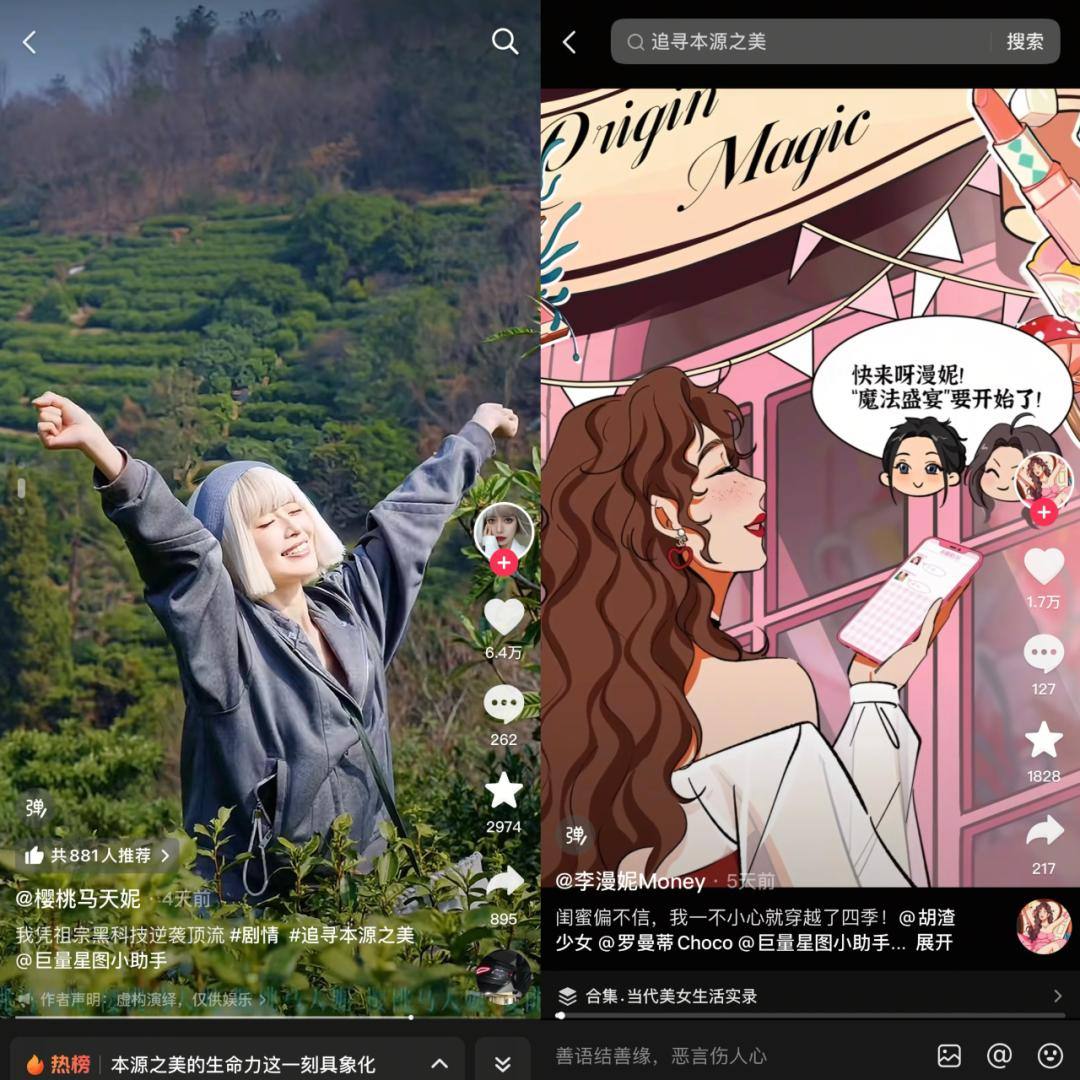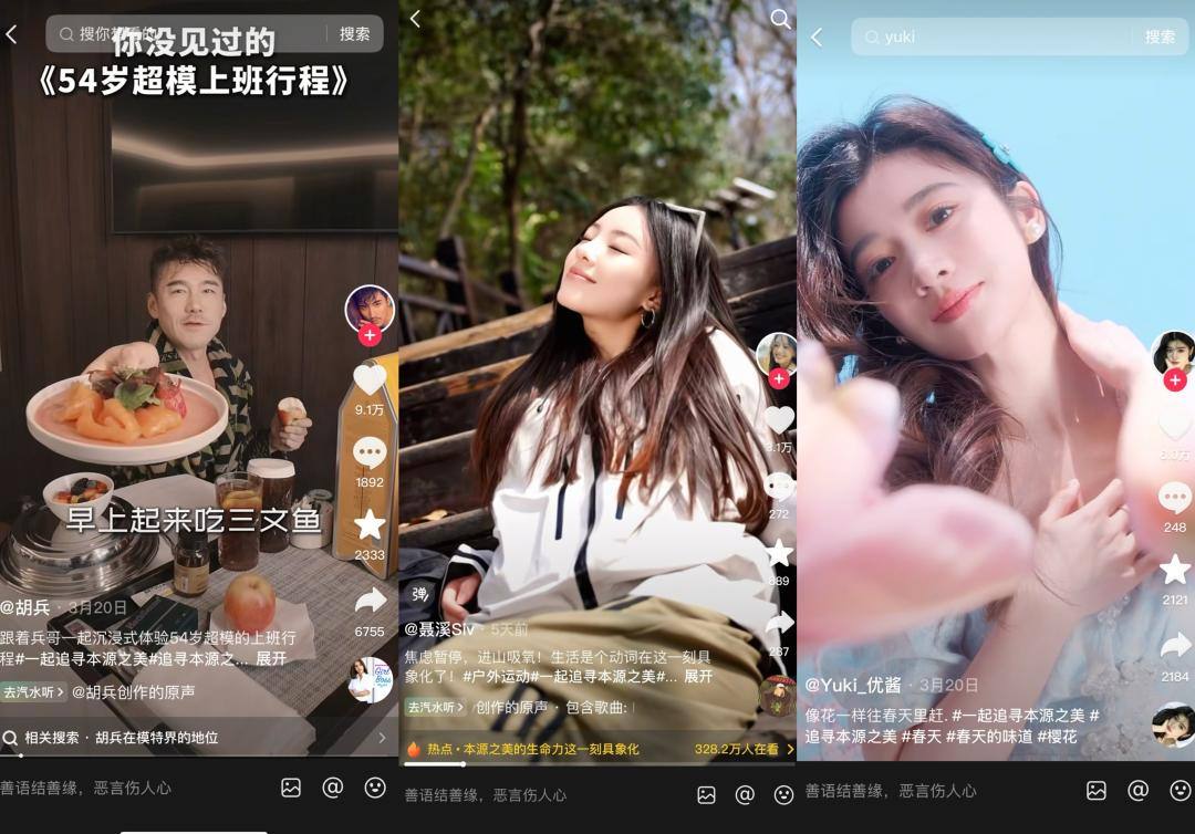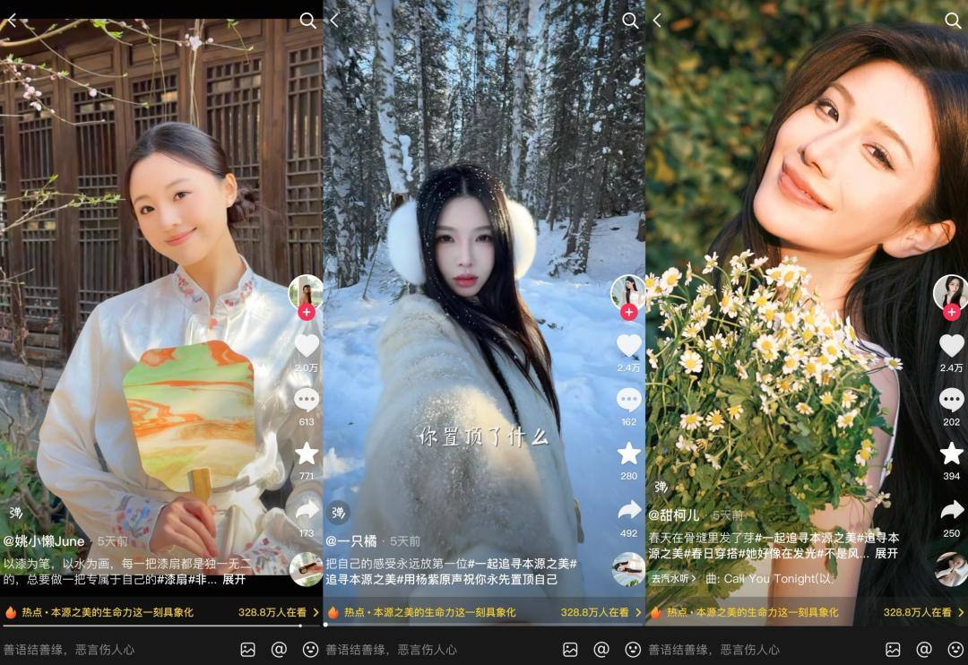 在熱點側,圍繞#追尋本源之美 這一話題,化身“全球溯源推薦官”的明星@胡兵 帶領用户沉浸式體驗超模高能量的上班日常;超20位高顏值達人們則展開多元創作,有的以視頻記錄下春日的氛圍感,有的則以VLOG的形式分享户外防曬和妝容的實用技巧。