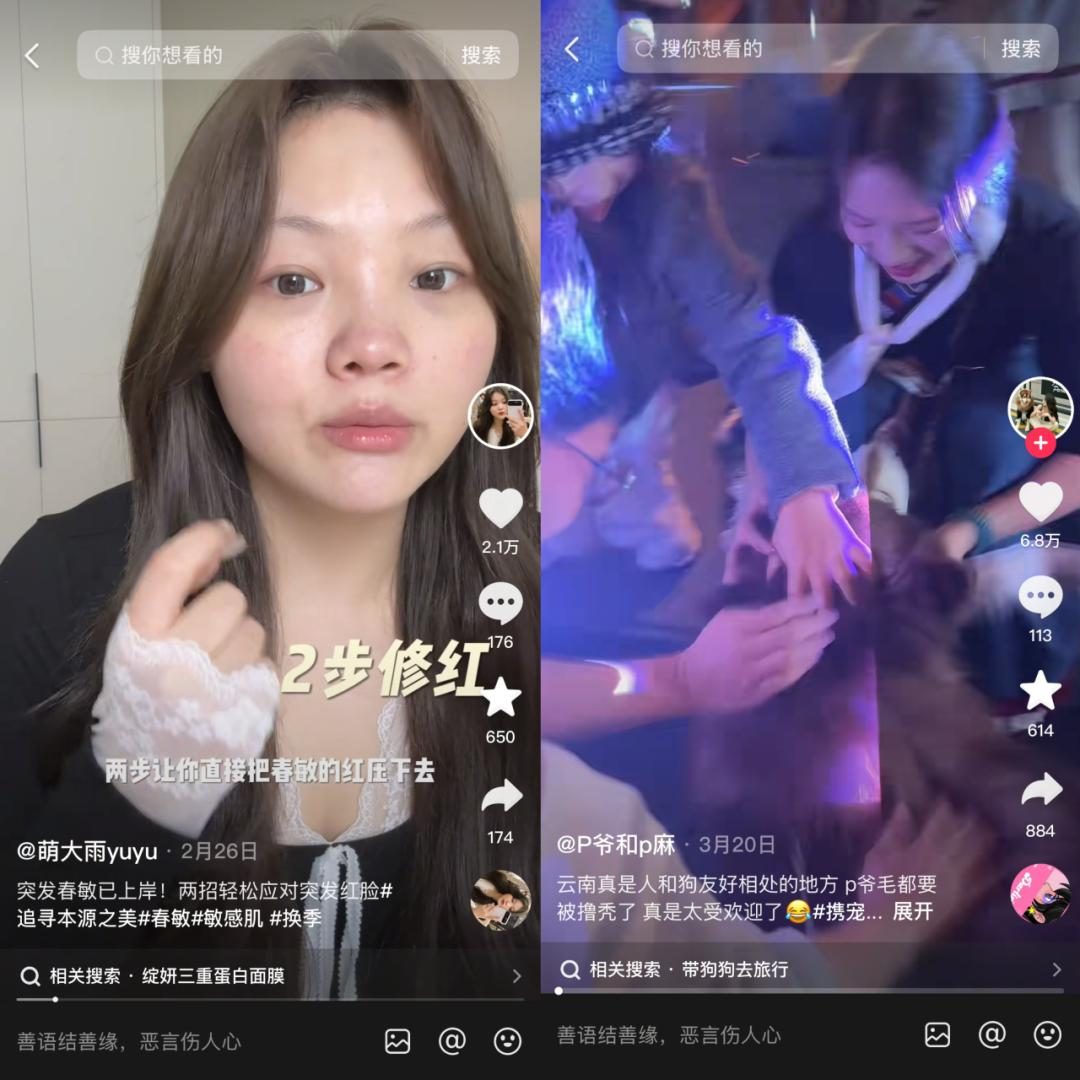 有的以爆改或真實測評,解析明星產品的成分和使用方式,比如@萌大雨yuyu 就基於真實使用體驗,手把手教會消費者如何正確應對“春敏問題”;也有治癒人心的旅行溯源內容,比如帶着狗狗去雲南旅行的 @P爺和p麻 ,將萌寵旅行的快樂帶入溯源之旅……