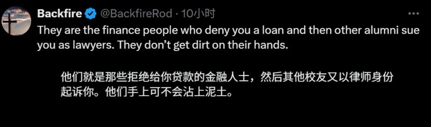 還有就是説哈佛畢業生是拒絕給“你”貸款的金融人士、會以律師身份起訴“你”。