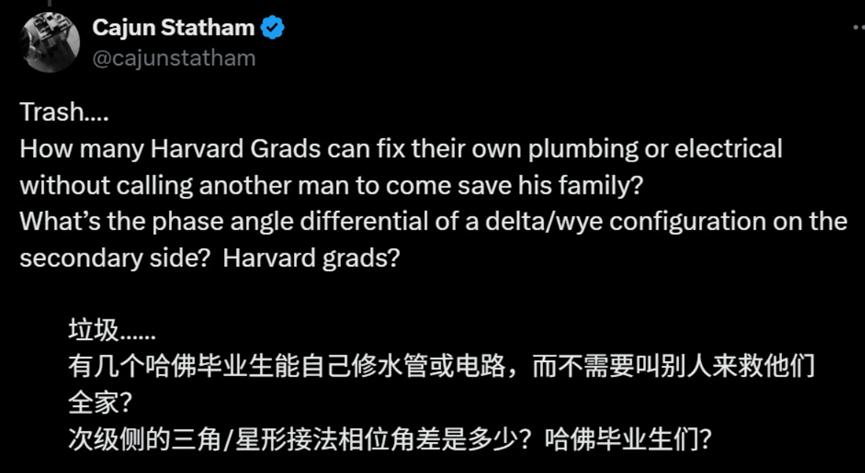 比如,現在美國網絡輿論也有大量聲援特朗普的MAGA聲音,在各種嘲諷哈佛畢業生,比如嘲諷哈佛畢業生不會修水管、電路,也不會修車