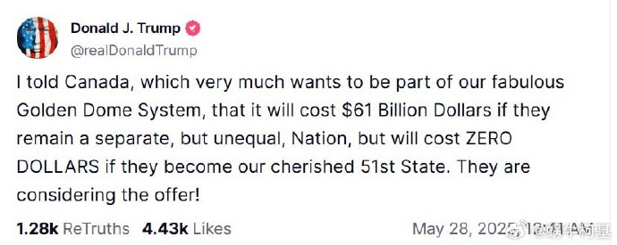 特朗普告訴加拿大,要麼花610億獲得獨立主權並且加入神奇的金色穹頂項目,要麼加入美國成為第51個州免費使用。