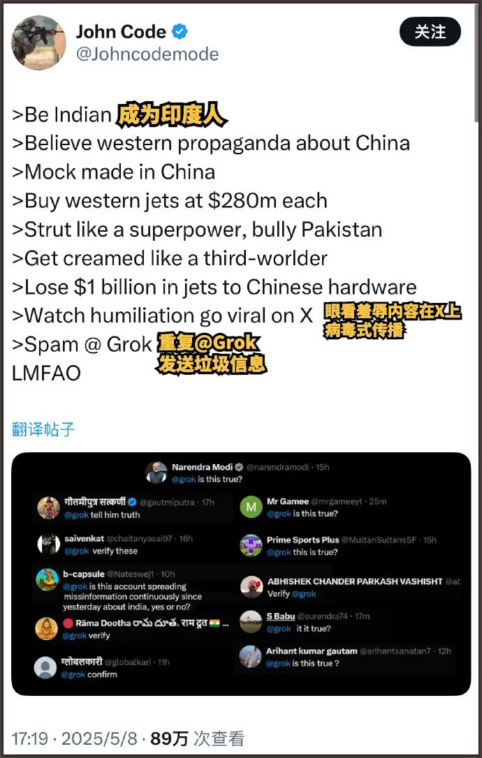 像前段時間,印度剛買的陣風戰機不是被 J10C 打了麼?X 上面一堆心碎三哥在新聞帖子下面不停地 @Grok is This True?