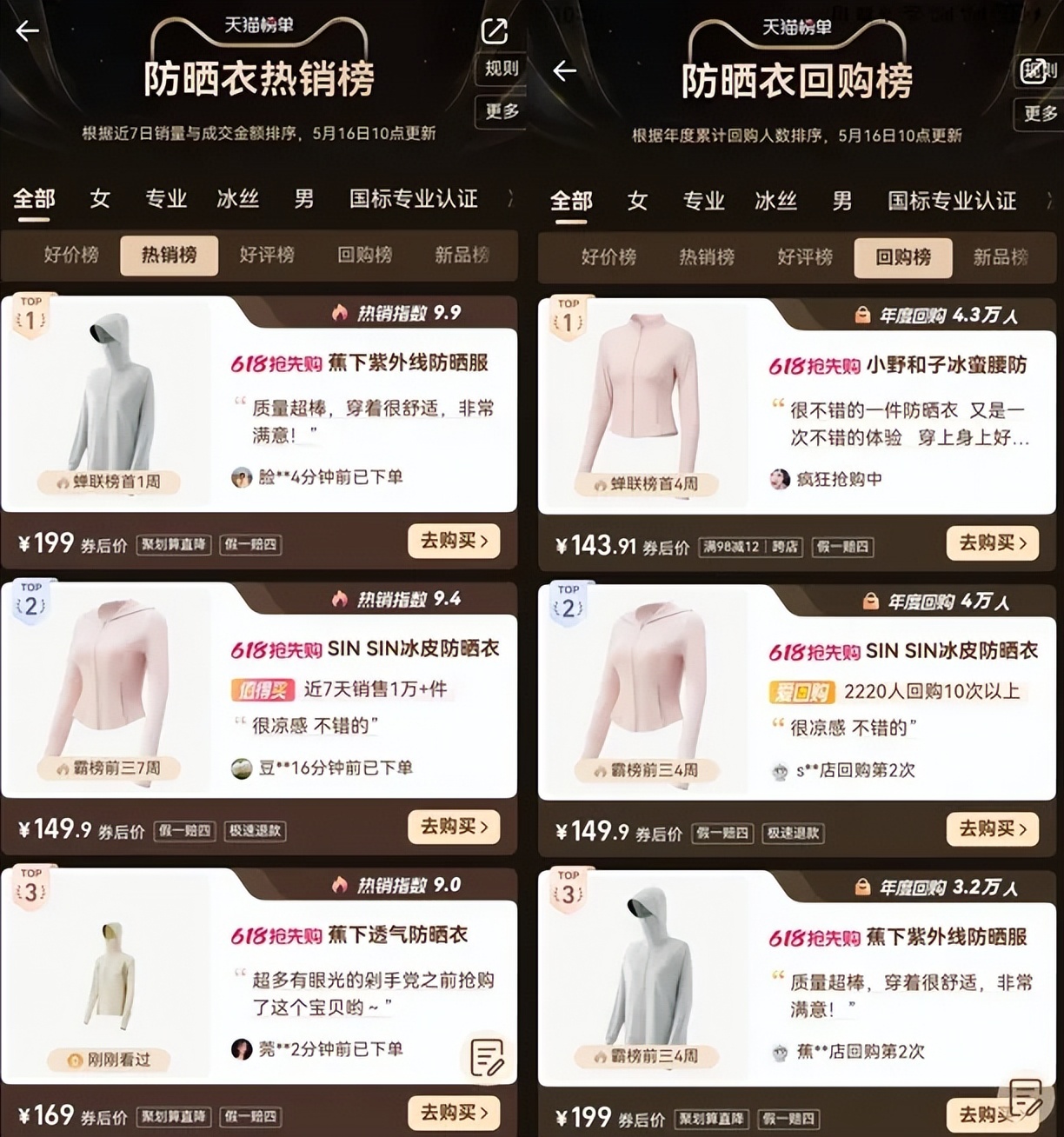 防曬衣的核心技術並不複雜,防曬性能各家基本上已經卷無可卷,市面上的主流產品清一色紫外線阻隔率>99%、UPF(紫外線通過/未通過衣物接觸皮膚的強度比值)高達數百,哪怕還有細微的差距,消費者也很難有清晰感知。