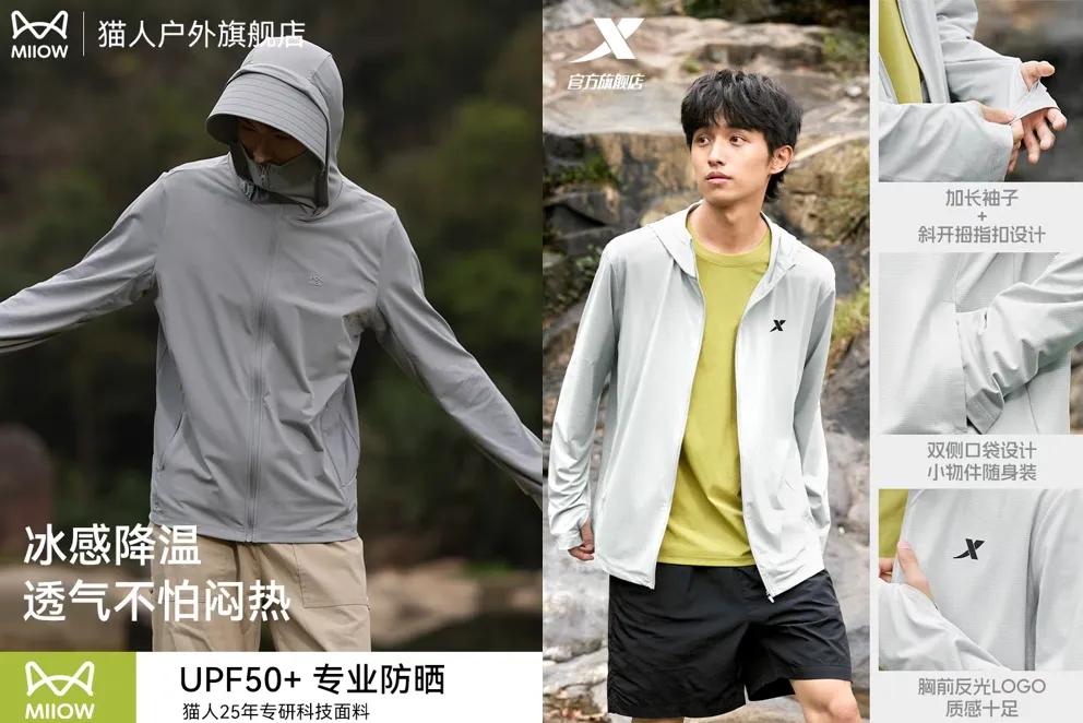 **首先是對穿搭場景進行更細緻的劃分,如户外運動細分到騎行、跑步、垂釣、登山等不同領域,再根據其特點提供針對性產品。**比如面向男性用户扎堆的釣魚場景,貓人、回力、安踏等品牌都推出了釣魚防曬服系列,針對釣魚久坐、户外空氣悶熱的狀況,重點改善透氣性,以遠超國標規定的涼感係數為賣點;而面向騎行愛好者的防曬服,則突出高彈性、吸汗排汗效果,像特步的新款“綿綿冰3代”防曬服,還根據騎行運動特點改良了側口袋、拉鍊、帽型這些細節,讓用户在騎行的時候更加方便。