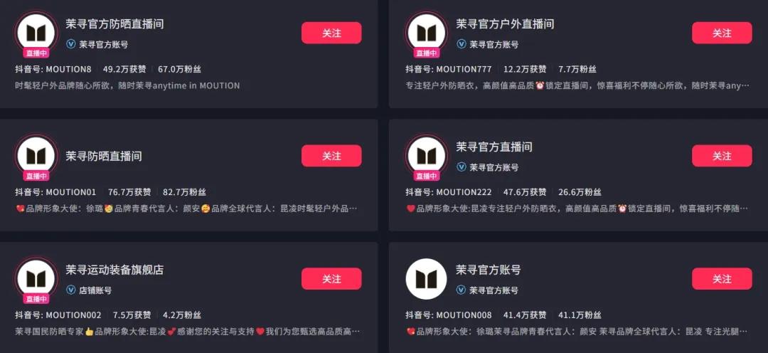 明星投入更多,相對應的,品牌在達人上的投入就明顯收縮。飛瓜數據的報告就指出,和兩年前相比,達人推廣的銷量佔比明顯下滑,品牌自營銷量佔比超過54%。像是茉尋這樣的頭部品牌,就已在抖音搭建了超過20個賬號矩陣,核心都放在能夠直接賣貨的自播上。