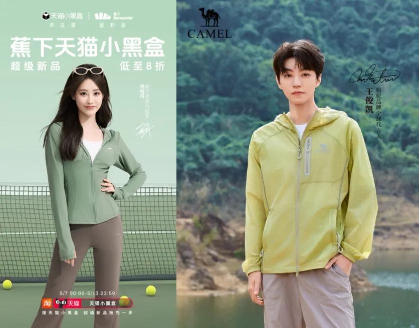 比如蕉下圍繞代言人祝緒丹做推廣,在天貓、京東、唯品會等平台上,讓用户可以一鍵搜索明星同款;茉尋打出“你和明星達人只差一件防曬衣”的口號,在各種電商、社交渠道狂刷徐璐、昆凌同款穿搭;駱駝在近期多項活動中發起抽獎活動,讓王俊凱同款“沐光防曬衣”刷足存在感。