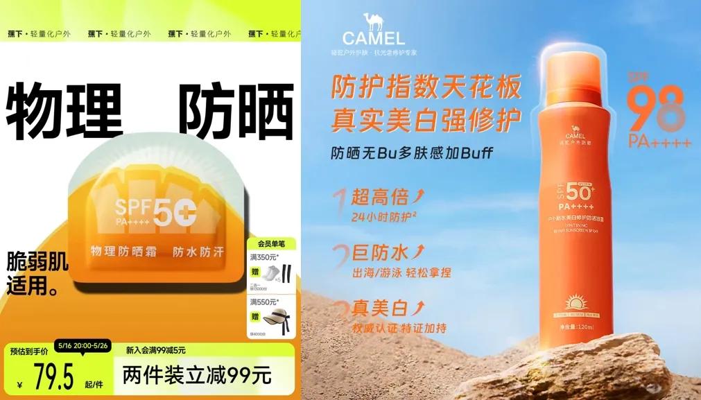 駱駝動作最大,線上、線下齊發力:今年年初,駱駝旗下防曬護膚品專門店“駱駝曬寶”正式進駐天貓,目前已積累過萬粉絲;3月中旬,其位於北京昌平區的線下門店被發現新增防曬護膚美妝用品專區,主推防曬噴霧、防曬霜和防曬面膜等產品。