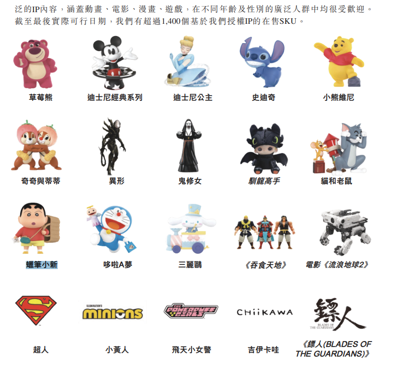 根據52TOYS招股書顯示,截至2024年末,公司擁有80個授權IP,涵蓋動畫、電影、漫畫、遊戲,包括蠟筆小新、迪士尼公主、草莓熊、史迪奇、貓和老鼠、哆啦A夢、吞食天地等。