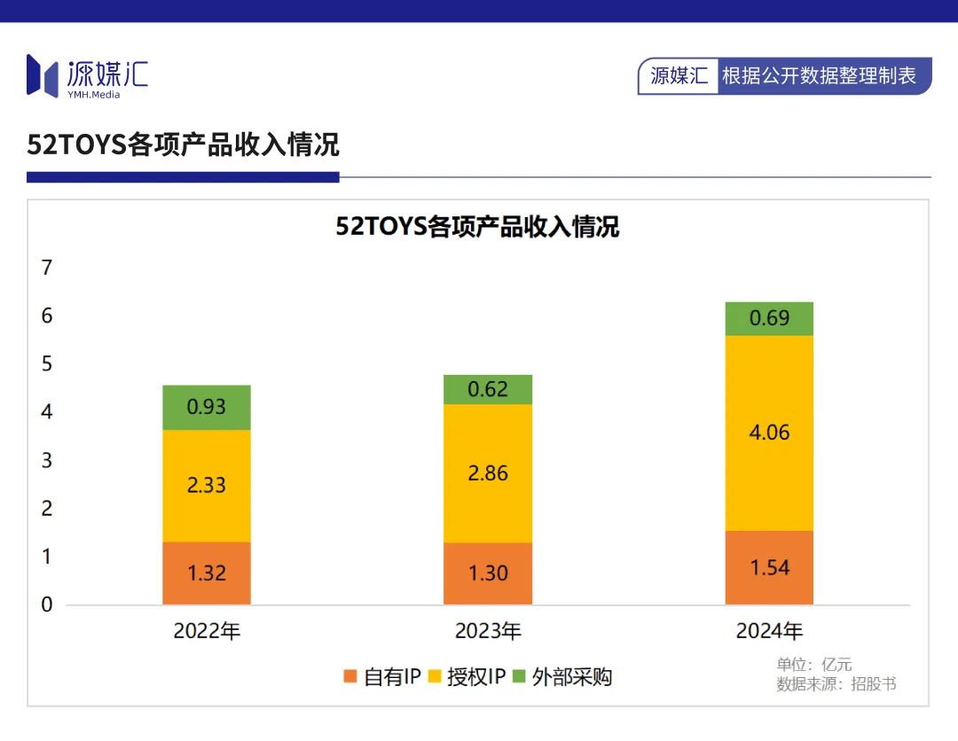 2022-2024年,泡泡瑪特的收入從46億元提升至130億元,複合年增長率為43.34%。而52TOYS則從4.63億元增長至6.3億元,複合年增長率僅為10.83%,跑輸市場整體增速。
