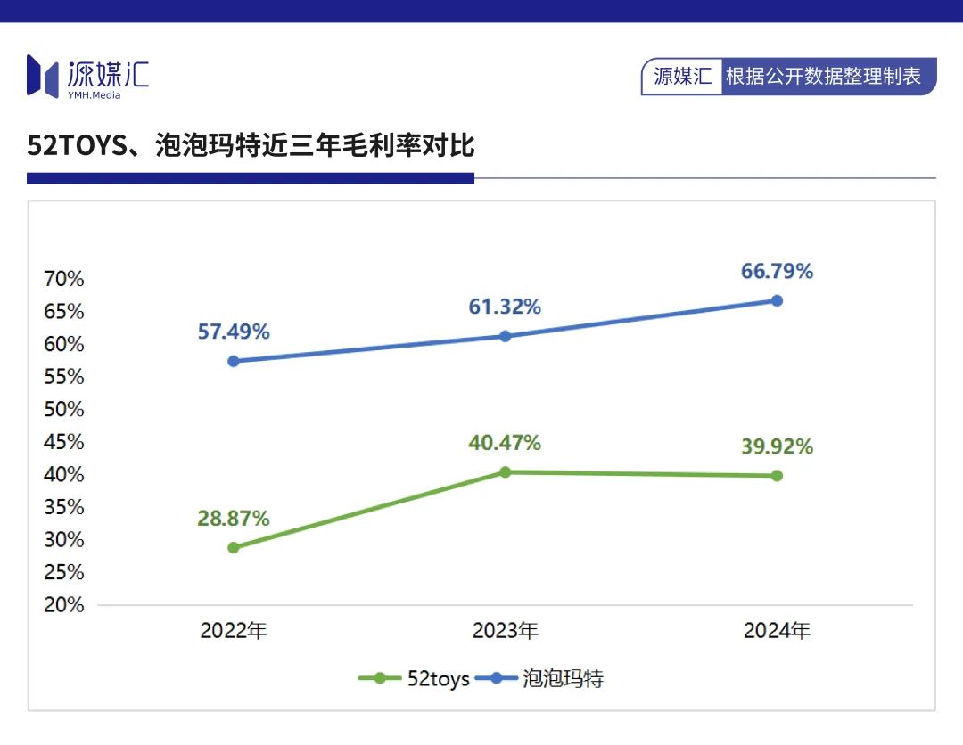 這讓泡泡瑪特的毛利率仍保持逐年上漲,從2022年的57.5%提升至2024年的66.8%。而52TOYS的毛利率則是先漲後降。
