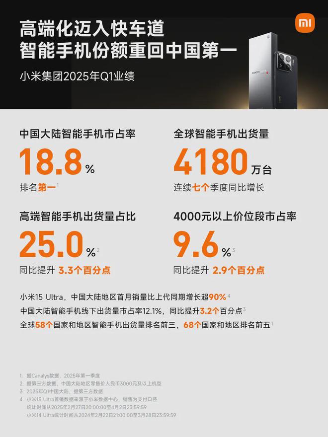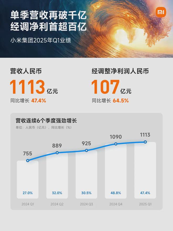 2025年第一季度,小米集團實現總營收1113億元,同比增長47.4%;經調整淨利潤107億元,同比增長64.5%,雙雙刷新歷史紀錄。
